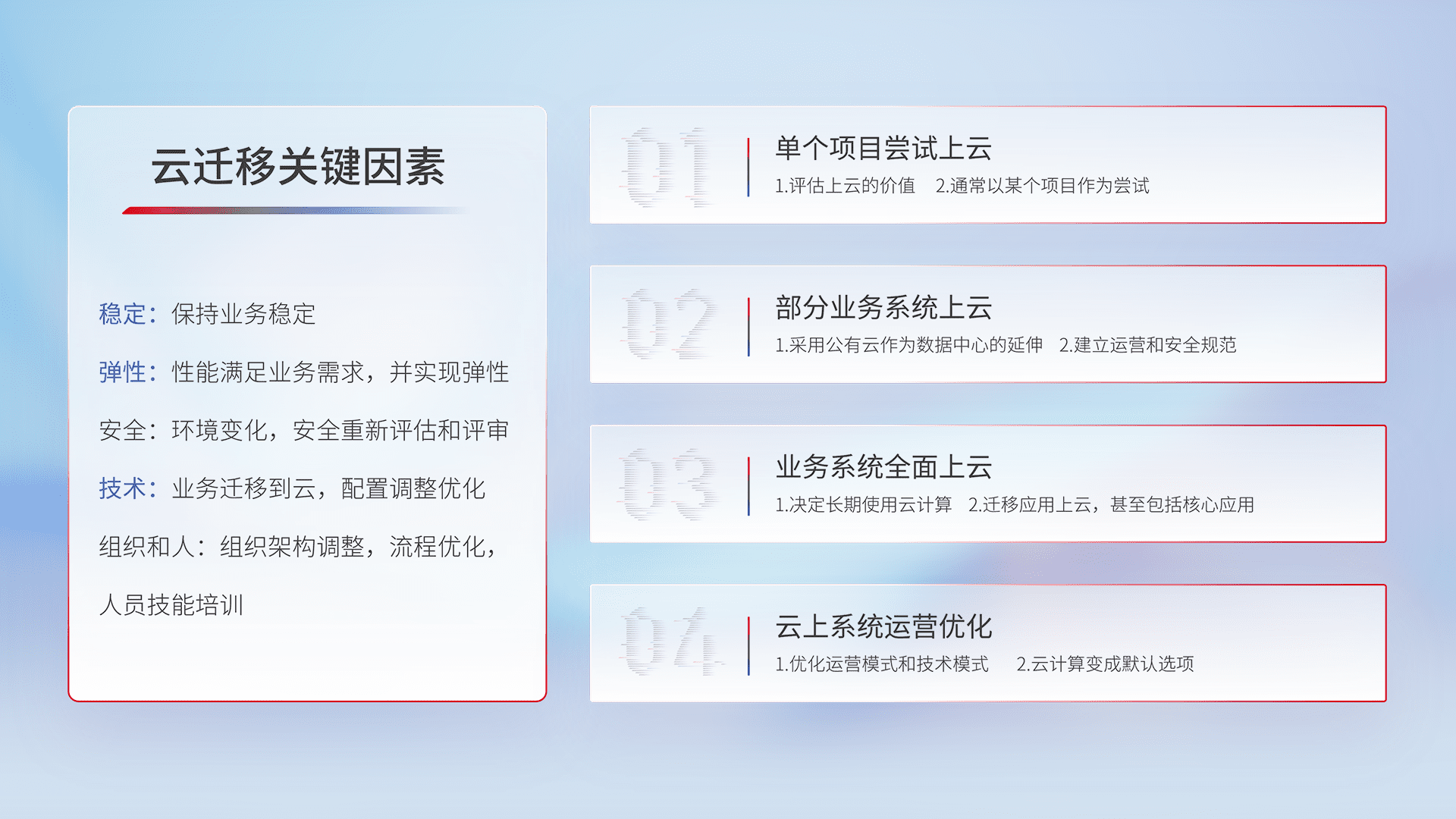 结合实际业务,,从规划设计、、云平台选型、、、、云原生改造、、、、数据迁移、、、集成交付,,,,迁移全过程为客户识别最佳上云路径,,做好风险识别管理,,,,设计网络架构、、、身份权限、、安全审计合规、、、、操作审计、、、日志审计、、监控告警策略、、、、多站点容灾设计等,,,对云上基础设施进行整体规划,,提升IT治理水平,,,以满足弹性、、、高可用、、、高性能的需求。。
