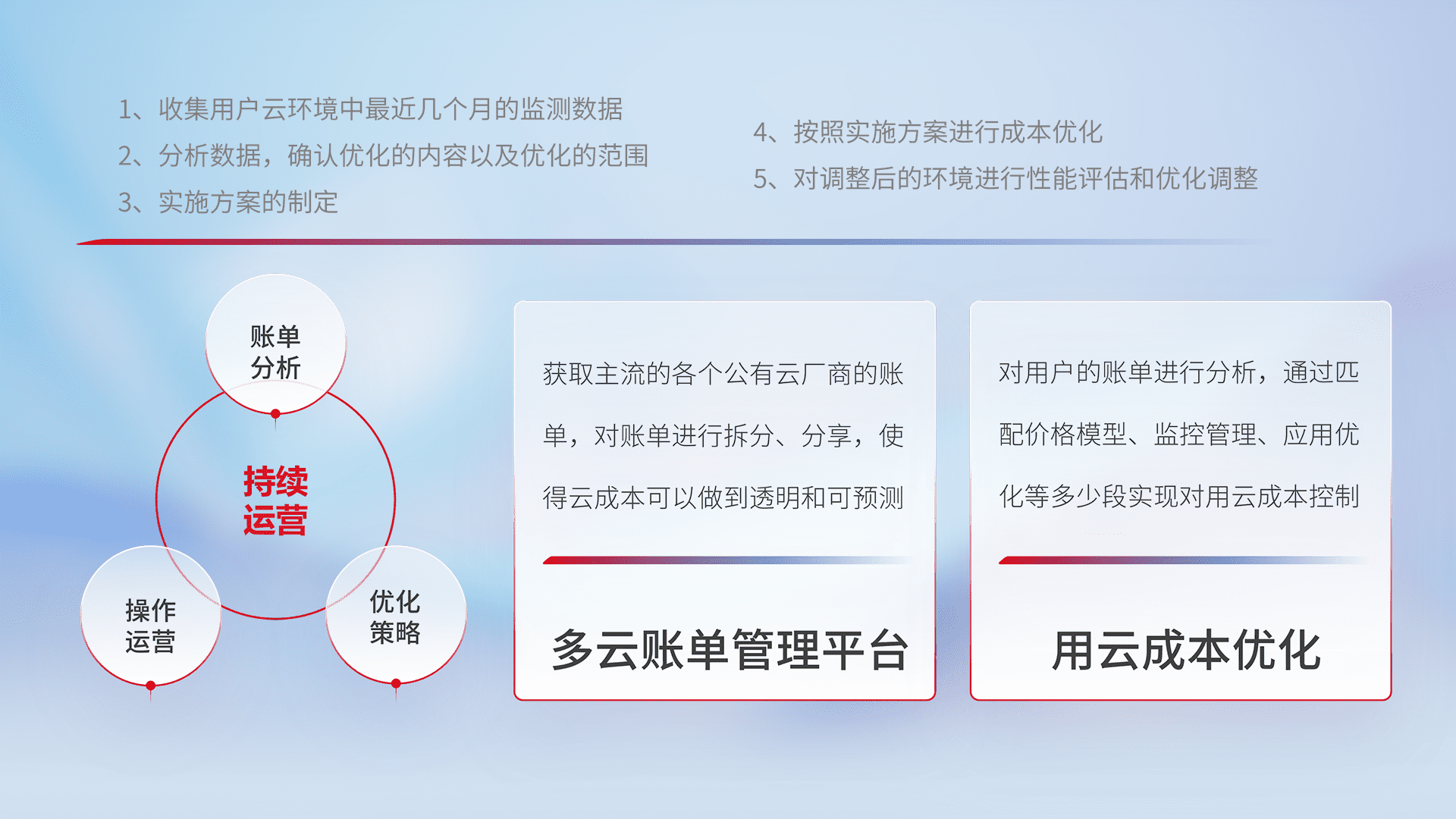 通过多云纳管,,以统一的资源数据模型把客户的云资源进行抽象和封装,,,,进而实现对多云资源的统一操作,,,保障云资源管理的可靠性、、、、稳定性与可用性。。。量身定制化运维内容,,配置、、、、开发运维、、、补丁管理、、、、备份、、、监控、、、认证和访问管理、、、、审计和日常巡检等,,,,保障在用云过程中的可靠度,,,,稳定度以及高可用率。。。